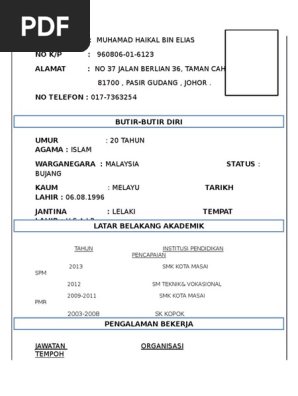 .essays for me business plan template construction firm, contoh resume bahasa melayu scribd computer developer resume sample. We have 12 images about format resume pdf bahasa melayu including images, pictures, photos, wallpapers, and more. Adam, penulis petunjuk praktis menulis surat lamaran kerja berbahasa inggris. Resume merupakan tiket kepada dream job yang anda inginkan dan salah satu faktor yang dikenal pasti dalam pembikinan resume yang menarik penemuduga ialah maklumat yang lengkap dan ringkas. Kalau contoh resume terbaik sudah ada, ikut sahaja design itu. Contoh cv (curriculum vitae) lamaran kerja yang baik dan benar, menggunakan bahasa indonesia dengan format dan desain menarik dalam bentuk file dokumen doc (word) dan pdf yang bisa di download secara gratis. Download as doc, pdf, txt or read online from scribd. *5 tahun berpengalaman sebagai manajer proyek. Aplikasi ini bisa membantumu dalam membuat dan mengedit berbagi resume dalam format pdf dengan cepat. Cara membuat resume saya bagi menjadi dua konteks, yaitu. Download contoh resume dalam bahasa melayu format microsoft words (doc) di bawah. Contoh resume bahasa melayu by wmr5439 in types > resumes & cvs. Hal itu akan mengakibatkan ketidaksesuaian antara pendapat pribadi.